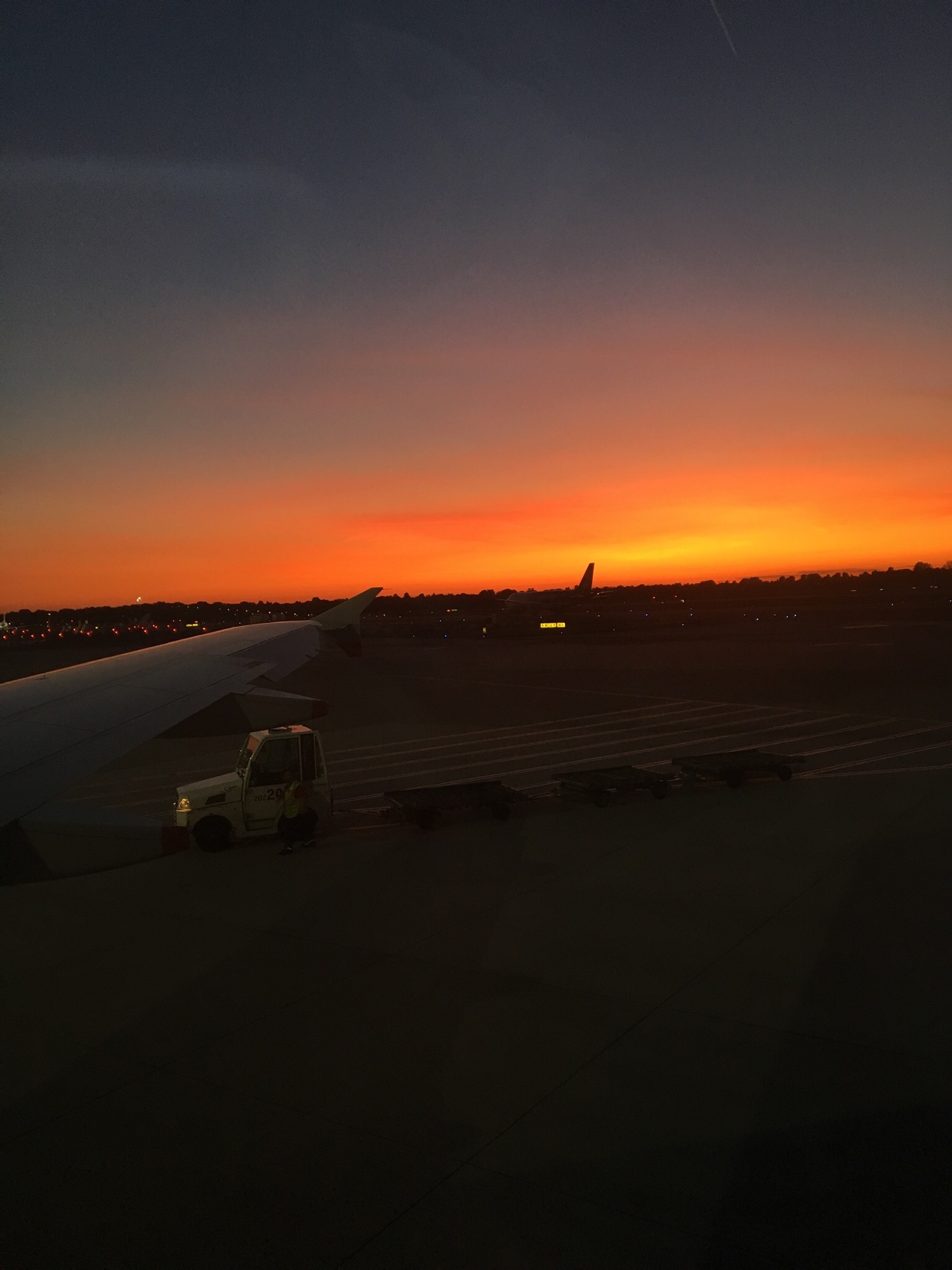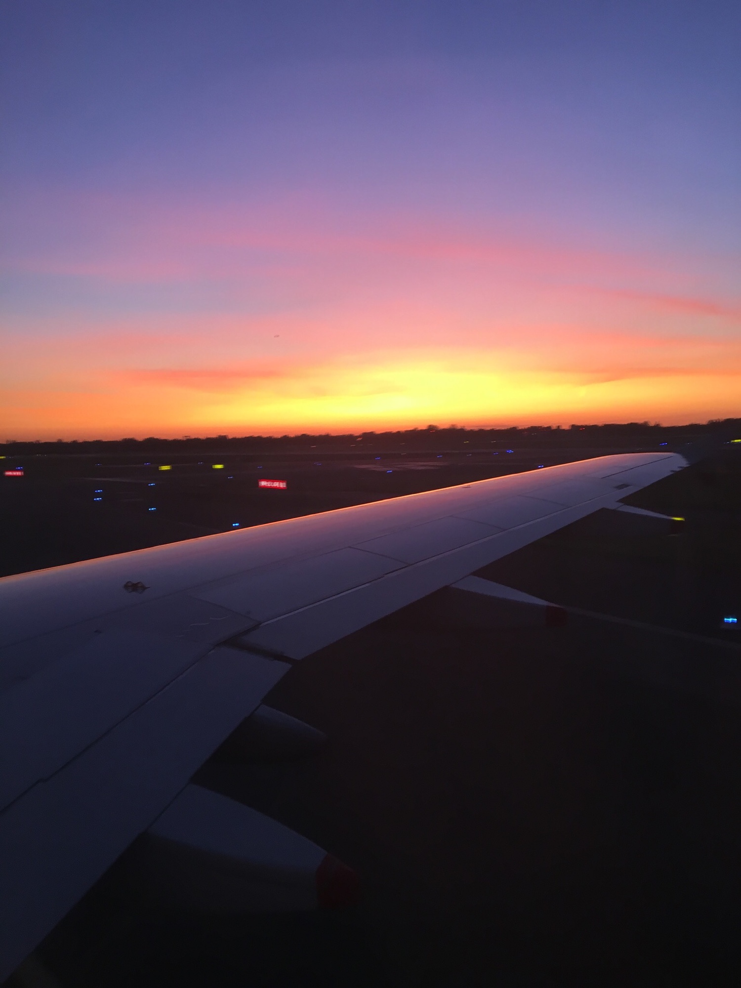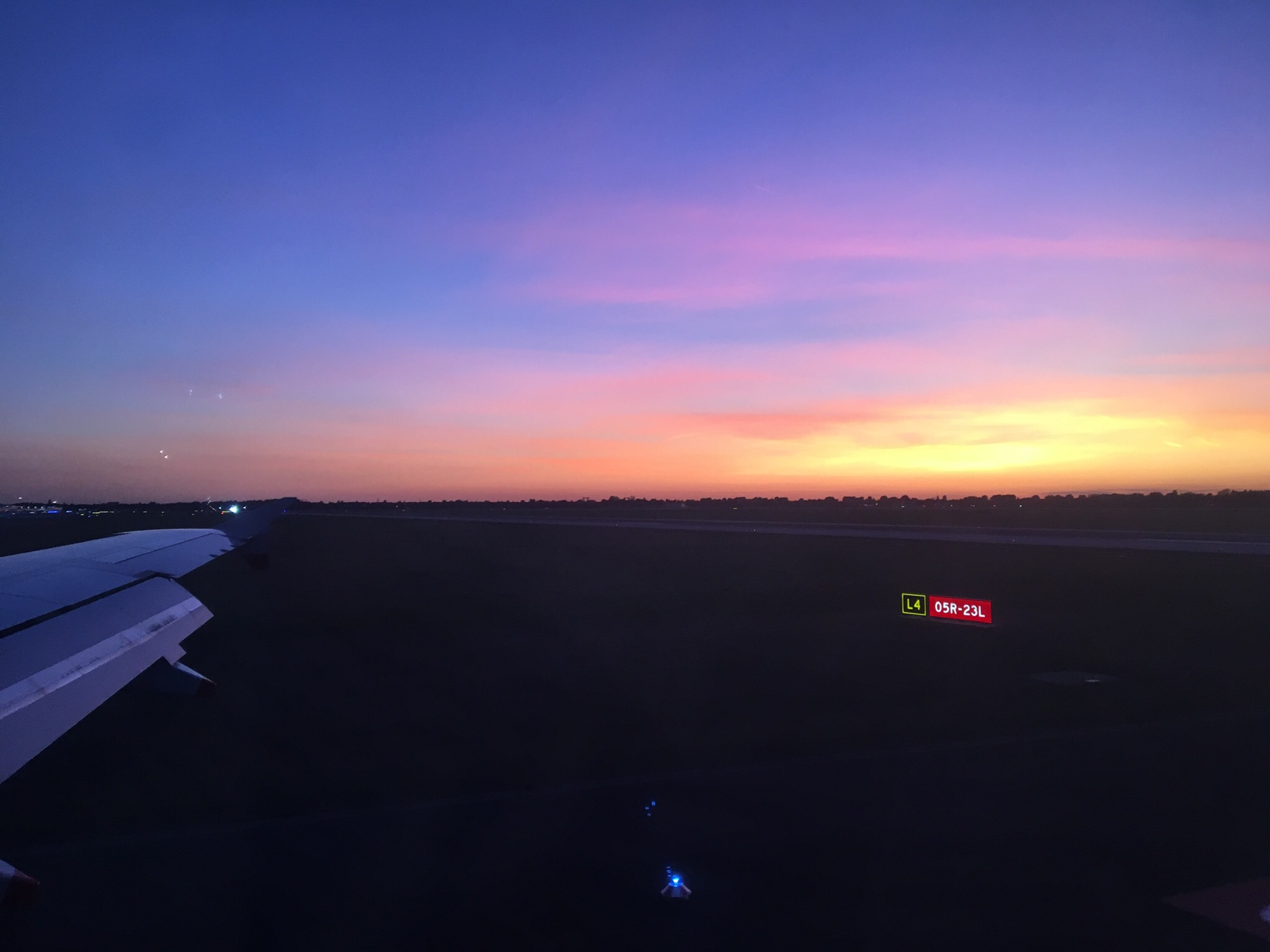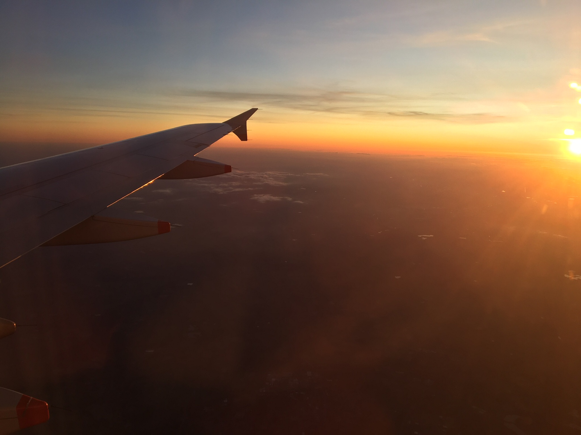 Nach dem langen Flug von Mexiko nach London, war der Flug von London nach Düsseldorf nun ein Katzensprung. Wir hatten Glück und ein sehr lustiger Kapitän begrüßte uns im Flugzeug mit einer Ansage. Nachdem er zunächst auf deutsch einen guten Abend gewünscht hatte entschuldigte er sich gleich darauf, da dies alles war was er auf deutsch sagen konnte und bat Passagiere die beide Sprachen beherrschten seine Ansage für die zu übersetzen, die nur Deutsch sprachen. Auch entschuldigte er sich für die Verspätung mit der wir losliefen würden, aber wir könnten die Schlange an Flugzeugen die vor uns waren ja selber aus dem Fenster sehen. Er versprach extra schnell zu fliegen. Ein Versprechen, dass er definitiv hielt, als wir sogar noch 3 Minuten früher als geplant landeten. In einem wirklich schönen Sonnenuntergang.