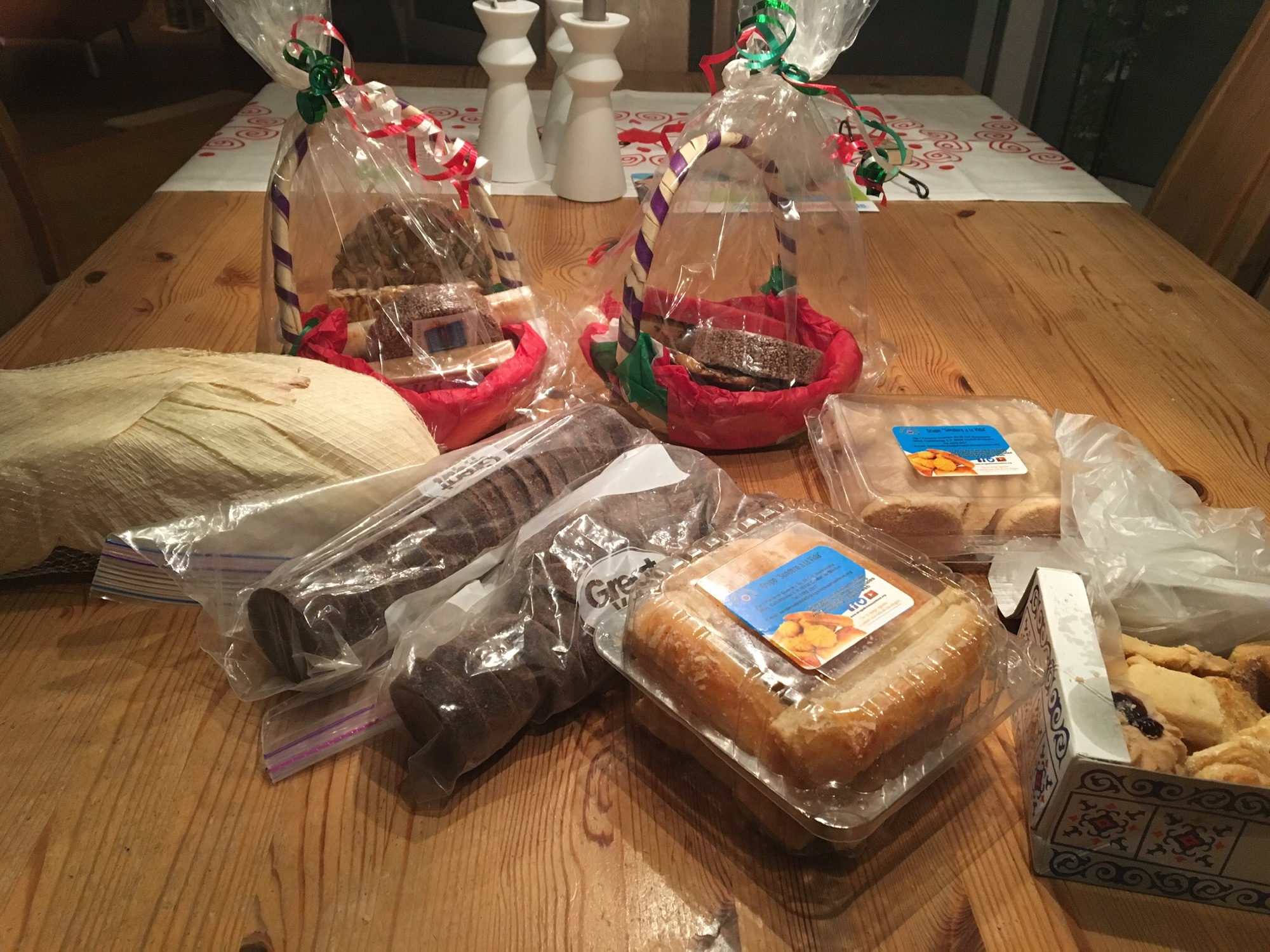 Diverse Kekse, Schokolade für Kakao, Maisblätter und zwei Geschenkkörbchen von Jesús und seiner Mutter