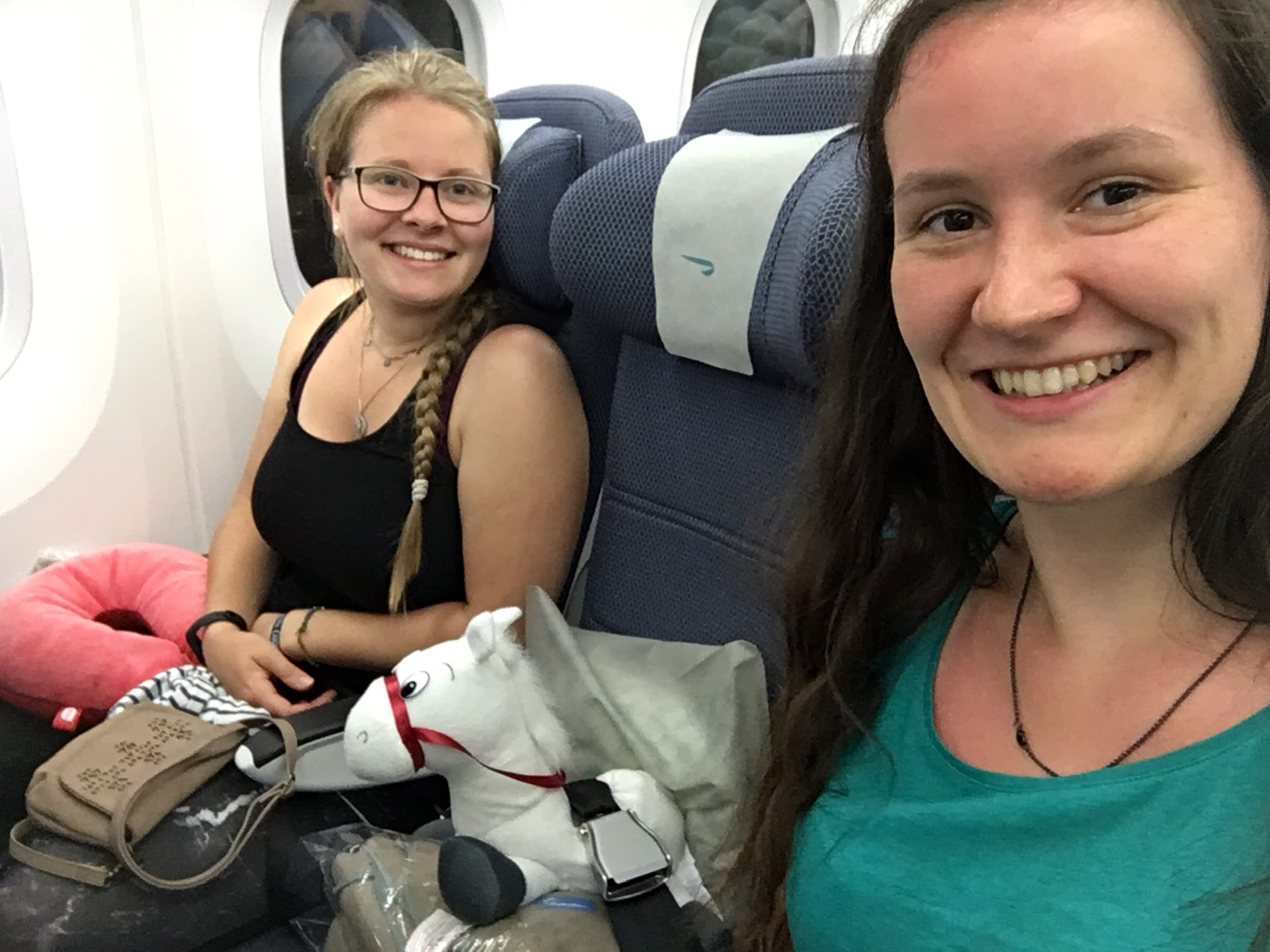 Wir wurden beide langsam Müde und waren froh, als wir gegen 22:30 Uhr endlich ins Flugzeug durften. Wir hatten die Plätze so gebucht, dass Caro erneut am Gang und ich am Fenster saß, in der Hoffnung, dass der mittlere Platz frei blieb. Dieser Plan ging nun auch tatsächlich auf und wir hatten etwas mehr Platz. Bis zum Abendessen schafften wir es auch beide wach zu bleiben, danach übermannte uns jedoch der Schlaf.