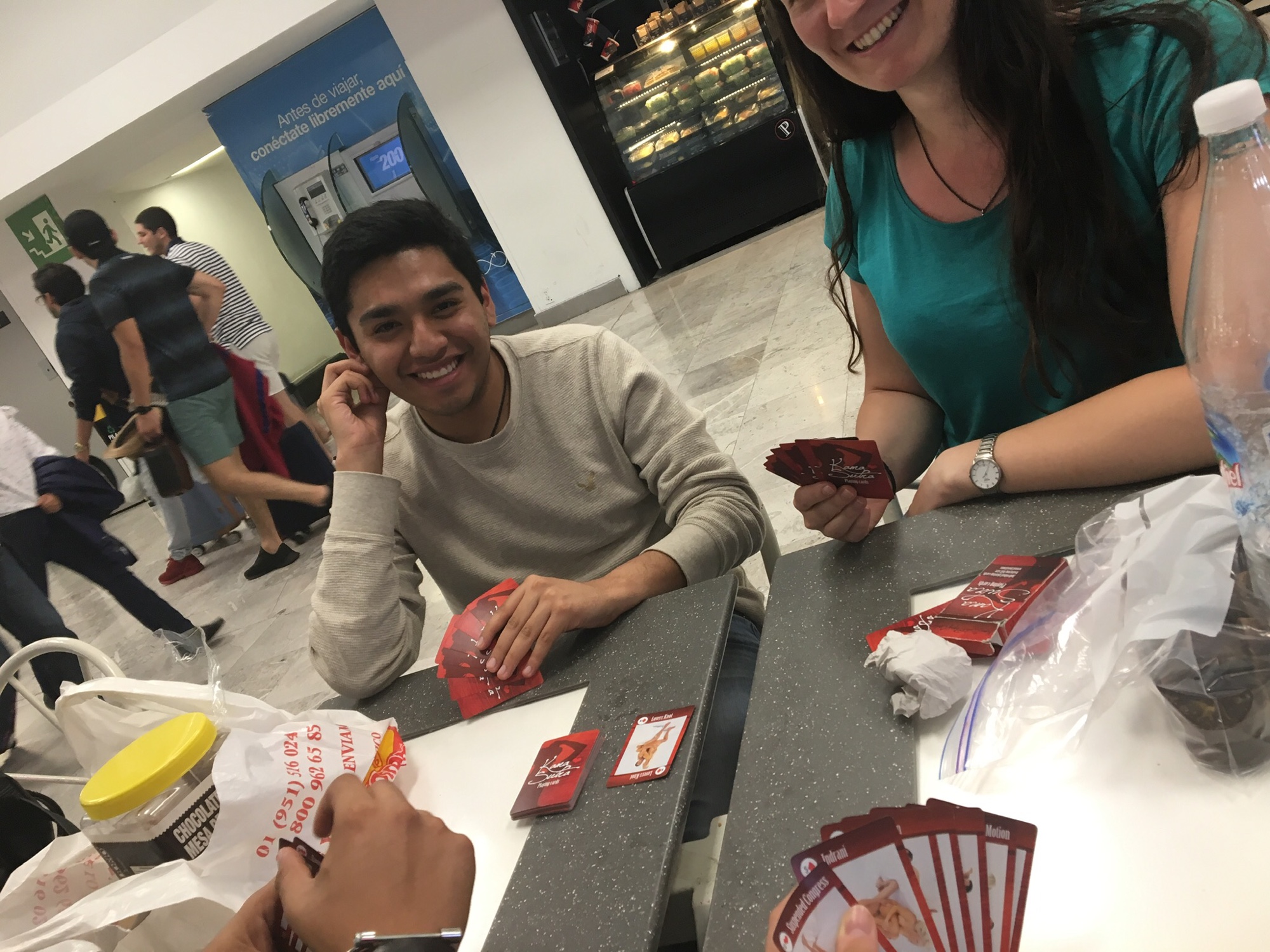 Am Flughafen waren wir mit Allan und Santiago verabredet, die einstimmig beschlossen hatten, dass sie uns unbedingt verabschieden und di verbleibenden Stunden verbringen wollten. Wir berichteten ihnen von dem Chaos mit unseren Flügen und dass wir dies als erstes klären mussten. Ein erneuter Blick in die App der Fluggesellschaft bestätigte nicht nur weiterhin die Verspätung sondern zeigte und plötzlich einen neuen Flug an. Dieser sollte statt über Amsterdam mit verspäteter Abflugzeit um 23:30 Uhr nun um 23 Uhr über London gehen. Damit war die Verwirrung komplett. Trotz intensiver Suche konnten wir keinen Informationsschalter von KLM finden und liefen zum Check-In, vor dem sich bereits eine Schlange gebildet hatte. dort erklärte uns eine Mitarbeiterin, dass es keinen Infoschalter gäbe und wir uns ganz normal mit für den Check.In anstellen mussten um weitere Hilf zu bekommen. Nach 40 Minuten waren wir an der Reihe. Der junge Mann am Schalter schien zunächst etwas verwirrt, erklärte uns dann jedoch, dass wir automatisch umgebucht worden waren, da wir aufgrund eines Streiks in Amsterdam so viel Verspätung hatten und auch unseren Anschluss nicht bekommen würden. Der neue Flug war für uns damit die bessere Option. Da unsere Ankunftszeit in Düsseldorf durch den neue Flug lediglich 3 Stunden später war erklärten wir uns damit einverstanden und diskutierten nicht weiter. Der Mitarbeiter suchte für uns dann auch noch die neue Buchungsnummer heraus, sodass wir direkt online einchecken konnten. Anschließend hatten wir noch 6 Stunden bis zum Abflug und suchten uns einen gemütlichen Platz zum sitzen um mit Santiago und Allan noch Karten zu spielen und uns zu unterhalten.