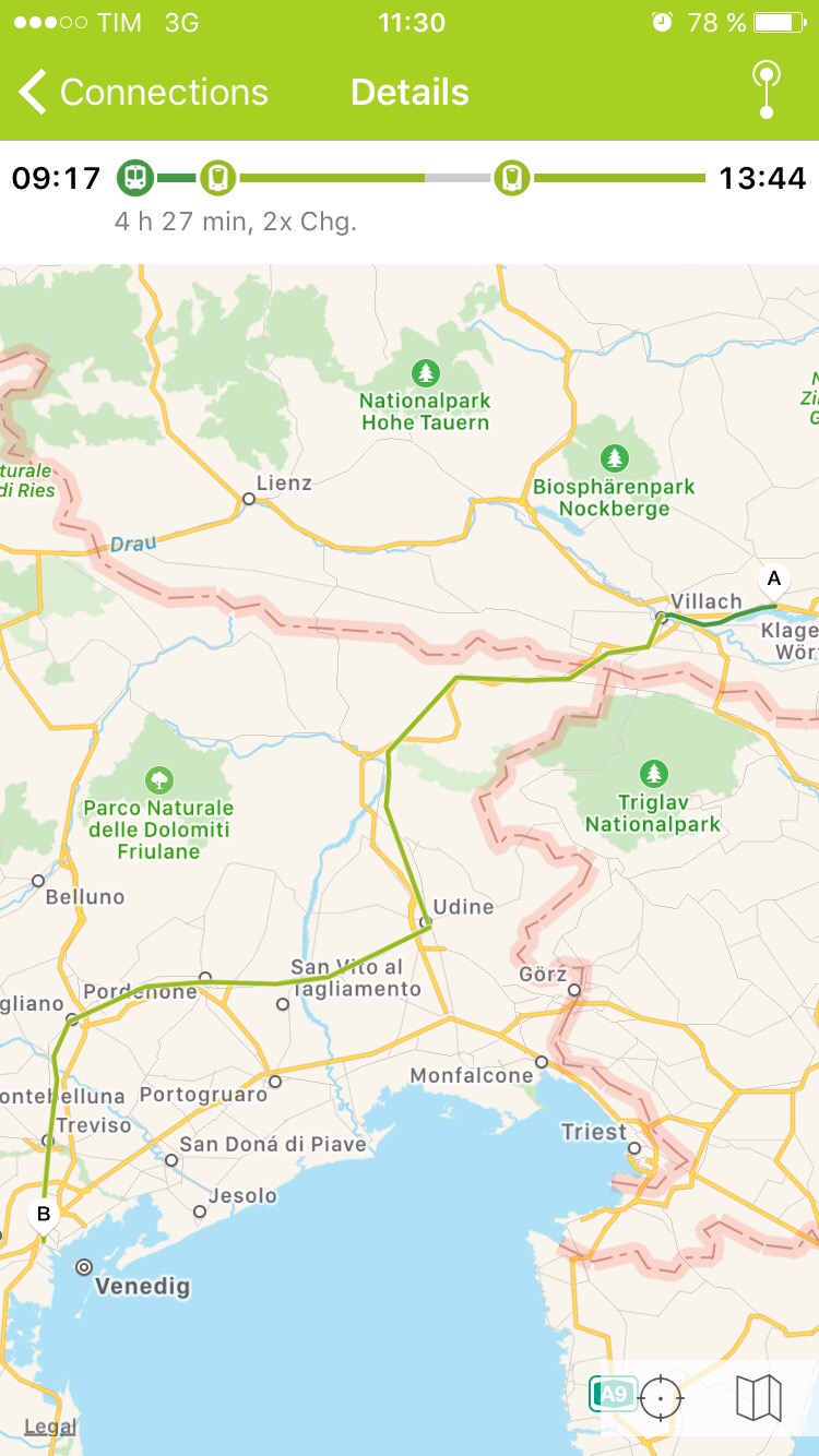 Die Hoffnung noch etwas vom schönen Alpenpanorama zu erleben, wurde leider nicht erfüllt. Im Österreich war nicht viel zu sehen und die Fahrt in Italien verlief zu 85% innerhalb von Tunneln. So kamen wir in Udine an und konnten sogar noch einen früheren Zug erwischen, sodass wir 20 Minuten früher als geplant in Venedig Mestre angekommen sind.