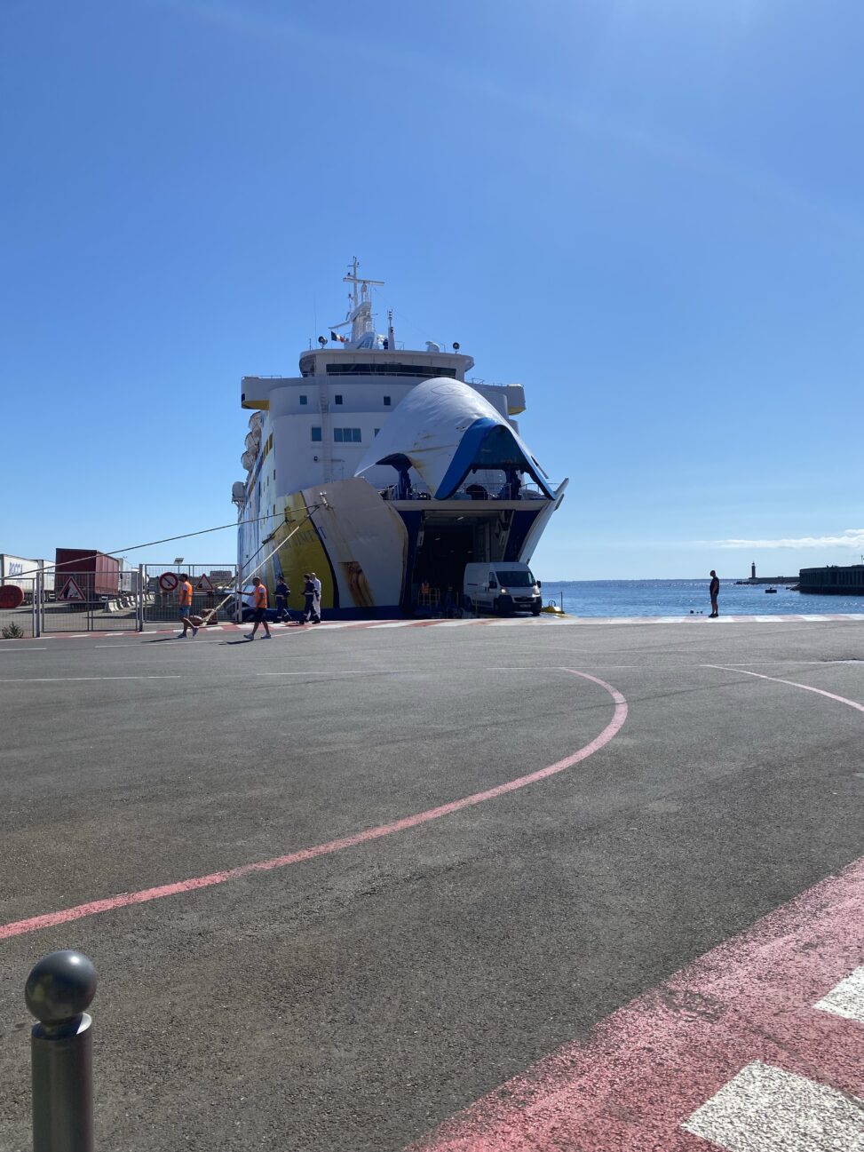 Abreisetag. Wir hatten bereits am Abend zuvor nachgesehen, wie lange wir bis zum Hafen brauchten. Eine knappe Stunde fahrt. Die Fähre sollte planmäßig um 14 Uhr ablegen, 2 Stunden vorher soll man dort sein. Bedeutet Abfahrt um 10:45 Uhr um noch etwas zeitlichen Puffer zu haben. Da die Strecke ziemlich geradeaus über große Straßen verlief erwarteten wir keine Verzögerung durch enge Kurven. Somit ließen wir uns beim Frühstück zeit (auch, weil wir frühzeitig aufgestanden waren) und fingen anschließen an, unsere Sachen einzupacken. Als wir gegen 10 Uhr noch einmal das Navi checkten, erschraken wir, da es nun plötzlich 1,5 Stunden bis zum Hafen dauern sollte und wir noch nicht alles eingepackt hatten. Wir beeilten uns und verließen gegen 10:40 Uhr den Campingplatz. Es lief allerdings so wie meistens, wenn man es eilig hat. Ein langsames Auto nach dem anderen vor uns. Zusätzlich ein Navi, was etwas verrückt spielt. Je näher wir Bastia kamen, desto größer wurde die Straße. An Kreuzungen (mit Kreisverkehr natürlich) gab es immer einen Tunnel für die Spur, die geradeaus führte. Am ersten Kreisverkehr leitete uns das Navi explizit auf die rechte Spur, in den Kreisverkehr und genau auf dieser war Stau, während die Spur durch die Unterführung lief. Am nächsten Kreisverkehr führte uns das Navi nun durch die Unterführung. Ihr könnt euch vermutlich denken, auf welcher Spur Stau war und auf welcher es halbwegs lief. Jan wollte aber lieber den Ansagen des Navis folgen, bevor wir nachher aus Versehen irgendwo anders landen und somit noch mehr Zeit verlieren würden. Nach einiger Zeit hatten wir den Großteil des Staus zum Glück hinter uns gelassen und es ging über ein sehr kurzes Stück Autobahn in die Stadt. Den Hafen erreichten wir dann mit nur zehn Minuten Verspätung. Dies interessierte dort jedoch niemanden und wir waren auch bei weitem nicht die letzten.