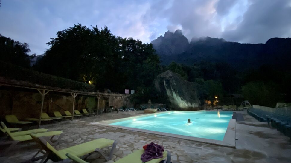 Dort hatten wir bereits den Abend zuvor einen Platz reserviert, da wir sicher gehen wollten, auf jeden Fall dort stehen zu können. Bereits vor der Reise haben wir über den Platz und vor allem die gute Pizza dort gelesen. Er liegt mitten in den Bergen, terrassiert über mehrere Ebenen und direkt unter Bäumen. Etwas unterhalb fließt der Rivière de Porto, in dem man bei warmen Wetter in verschiedenen Badegumpen schwimmen kann. Zusätzlich gibt es aber auf dem Platz selbst einen sehr schönen Pool mit Blick auf die Berge, der Abends sogar beleuchtet ist. Da wir reserviert hatten, zeigten sie uns einen Platz, den sie freigehalten hatten, wir durften uns aber anschließend noch selber umsehen, ob wir woanders stehen wollten. Wir liefen den Hang, an dem der Platz lag, hinauf und guckten uns verschiedene Ecken an. Am Ende fanden wir einen Platz, bei dem im vorderen Bereich ein „Reserviert“ Schild auf einem Stuhl stand. Auf dem hinteren (von uns begehrten) Platz stand jedoch nur ein Stuhl. Zur Sicherheit machten wir ein Foto und fragten an der Rezeption nach ob dort frei war. Wir hatten Glück und parkten den Bulli anschließend um.