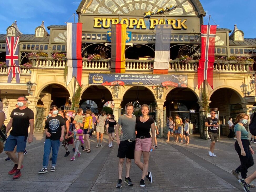 Erstaunlich munter, vermutlich auch durch die Helligkeit und die Geräusche der anderen, wachte ich bereits kurz vor dem Wecker auf. Da es für ein Frühstück Gefühl noch zu früh war, schmierten wir uns nur einige Brote und nahmen diese, zusammen mit dem restlichen Proviant mit. Pünktlich um 9 Uhr durchliefen wir das große Tor zum Europapark. Vorher war für uns schlecht abzuschätzen, wie viele Leute an diesem Tag wohl kommen würden (es waren noch Ferien in Baden Württemberg) und wie lang die Schlangen dann werden, weshalb wir am Tag zuvor beschlossen hatten als erstes zur größten, schnellsten (und am meisten G-Kräfte wirkenden) Achterbahn zu gehen. Dem „Silver Star“. Dort wird man zunächst einen wirklich hohen Berg hoch gezogen (73 m) bevor es dann 3 Minuten lang mit Spitzengeschwindigkeiten von bis zu 130 km/h über mehrer Hügel, Steilkurven und Kreisel geht. Dabei wirken Kräfte bis zur 4-fachen Erdbeschleunigung auf den Körper. Das bekamen wir bereits bei der ersten Abfahrt zu spüren und fragten uns beide kurz, warum wir uns das eigentlich antun und ob wir möglicherweise inzwischen zu alt sind für diesen Quatsch mit den Achterbahnen. Spoiler: Sind wir nicht, aber für eine erste Achterbahn war diese auch eine echte Herausforderung.