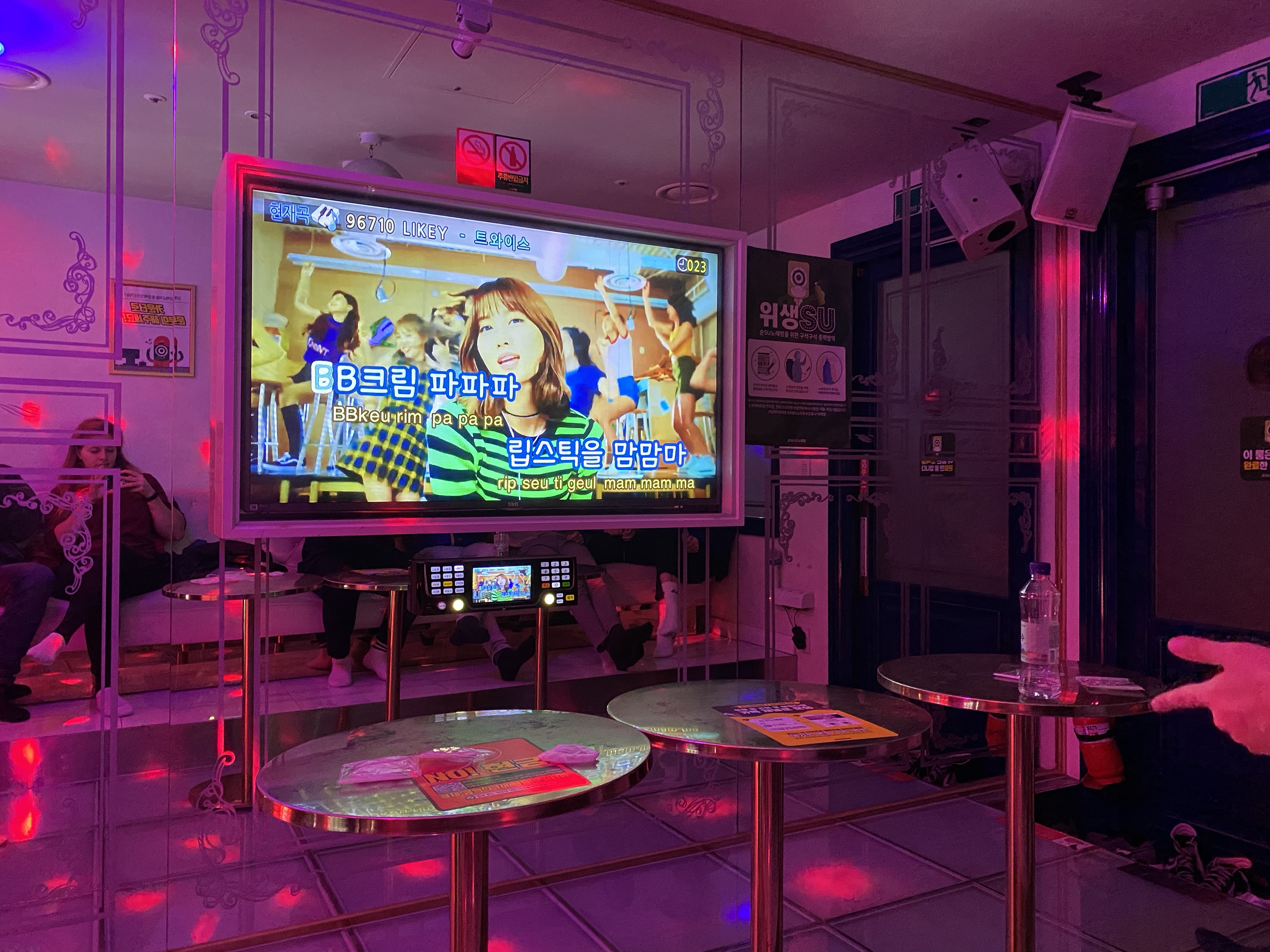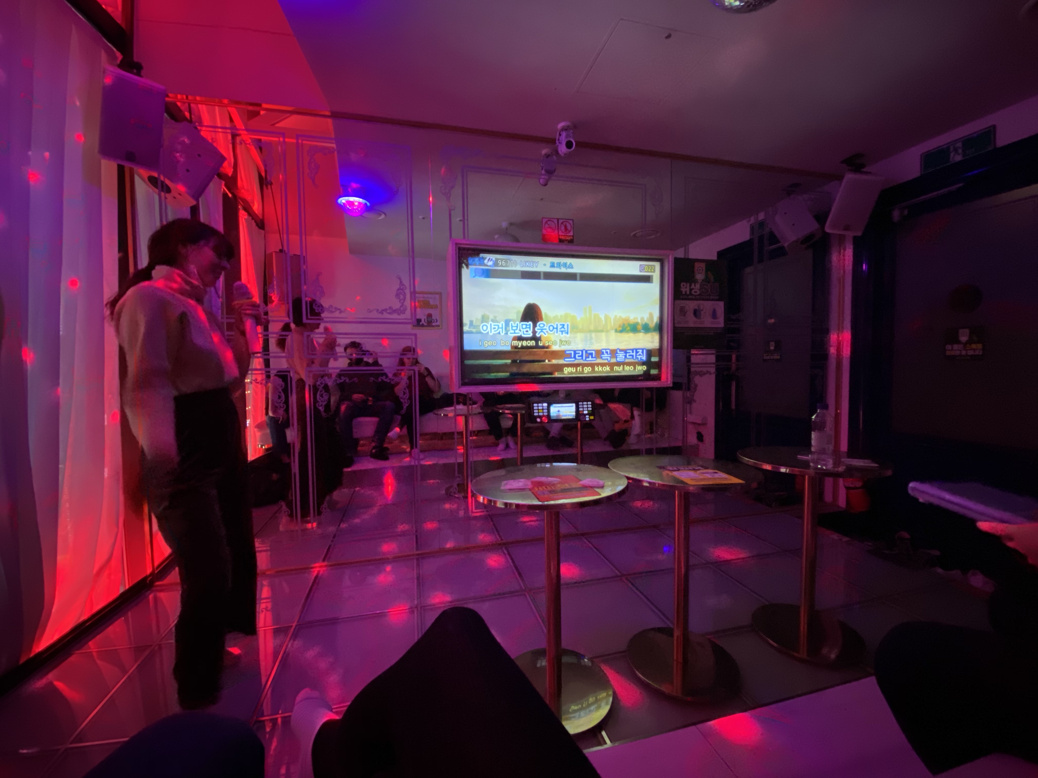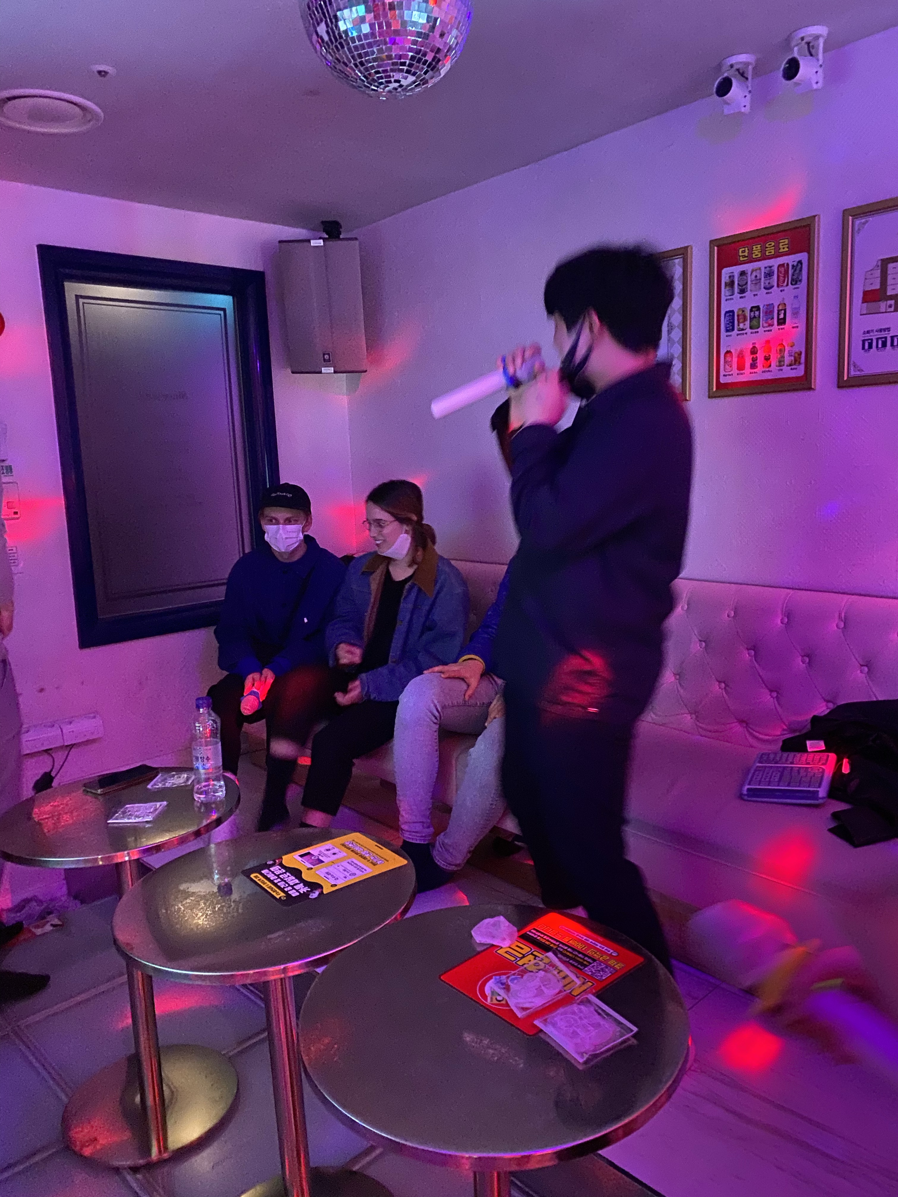 An diesem Abend ging wir das erste Mal einer typisch koreanischen Tätigkeit nach, welche endlich wieder möglich ist. Wir waren Karaoke singen! Dabei bekommt man mit seiner Gruppe einen eigenen, kleinen Raum, in dem es Sofas, einen großen Fernseher und natürlich Mikros gibt. Aus einer großen Auswahl Lieder kann man sich ein passendes Lied aussuchen und dieses singen.