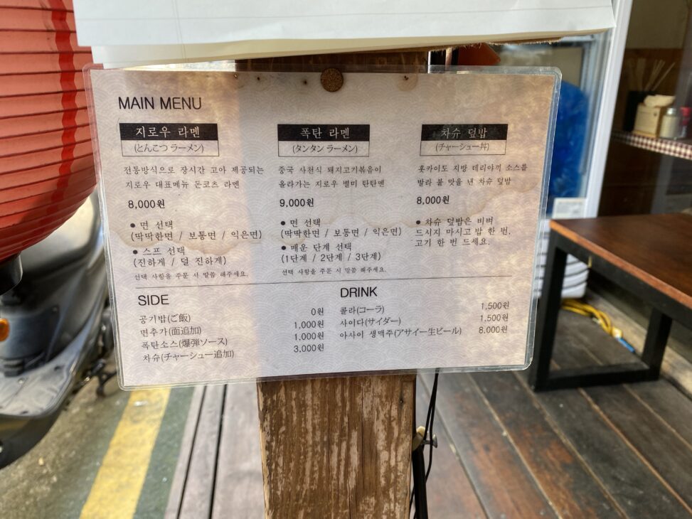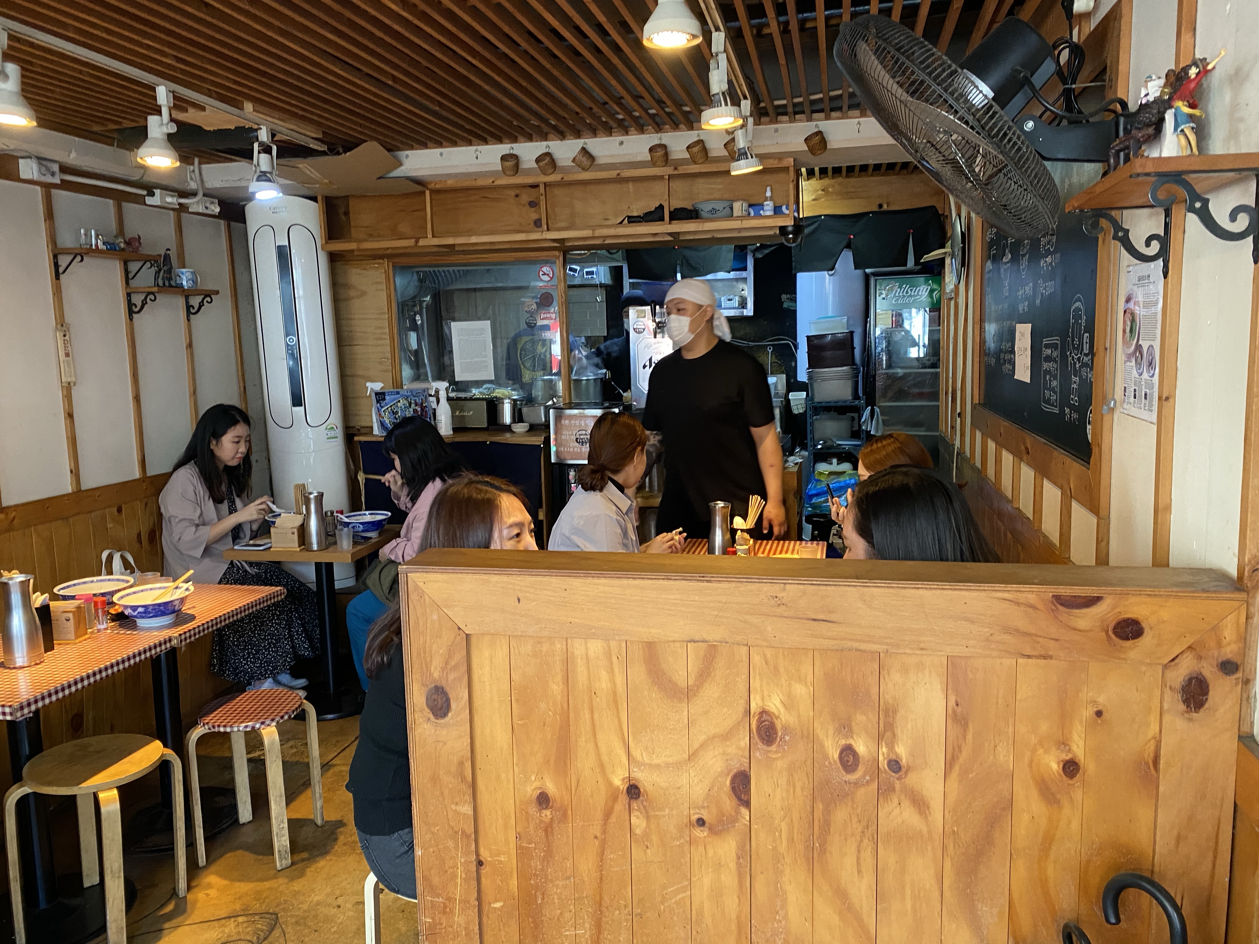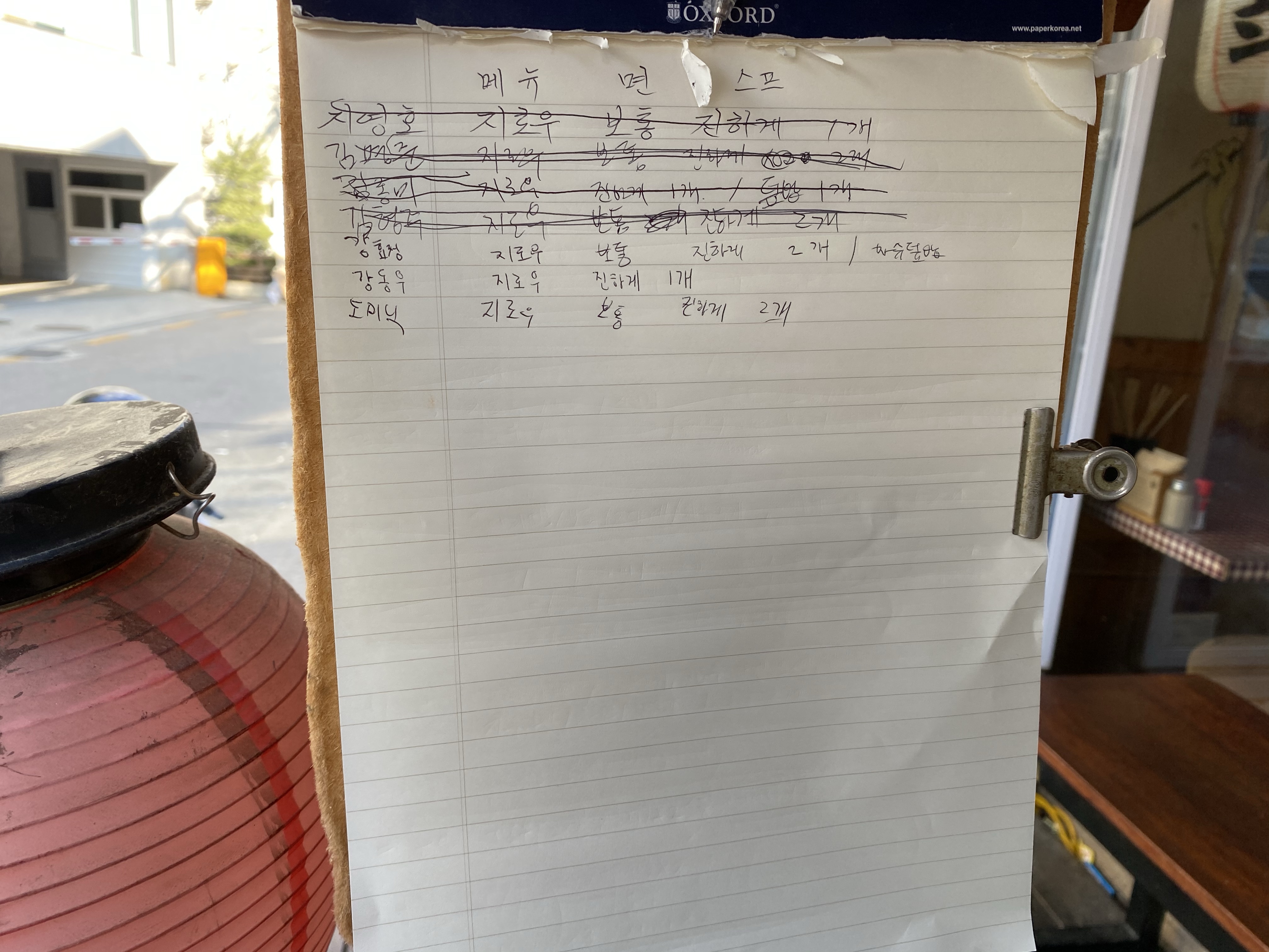 Sonntag ist Ramen Tag. Zumindest an diesem Sonntag. Ursprünglich wollten wir bereits einige Tage zuvor Ramen essen, waren jedoch nie dazu gekommen. Dominik war mit JD in einem kleinen Restaurant in der Nähe der Uni gewesen, welches sehr gute Ramen anbot. Der einzige Haken an der Sache war die Bestellung. Wir waren nur zu zweit, ohne Koreaner unterwegs und zum Bestellen schreibt man seinen Essenswunsch in eine Liste. Auf koreanisch natürlich. Wir hatten Glück, dass ein hilfsbereiter Koreaner direkt daneben stand und für uns alles eintrug. Für das nächste Mal haben wir ein Foto gemacht, damit wir wissen was wir bestellt hatten.